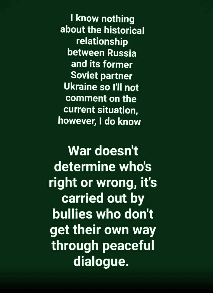 I know next to nothing about the ongoing conflict between Russia and its former Soviet partner Ukraine so I’ll not comment on that, however, what I know from history is that war doesn’t determine who’s right or wrong, it’s carried out by bullies who don’t get their own way through peaceful dialogue.