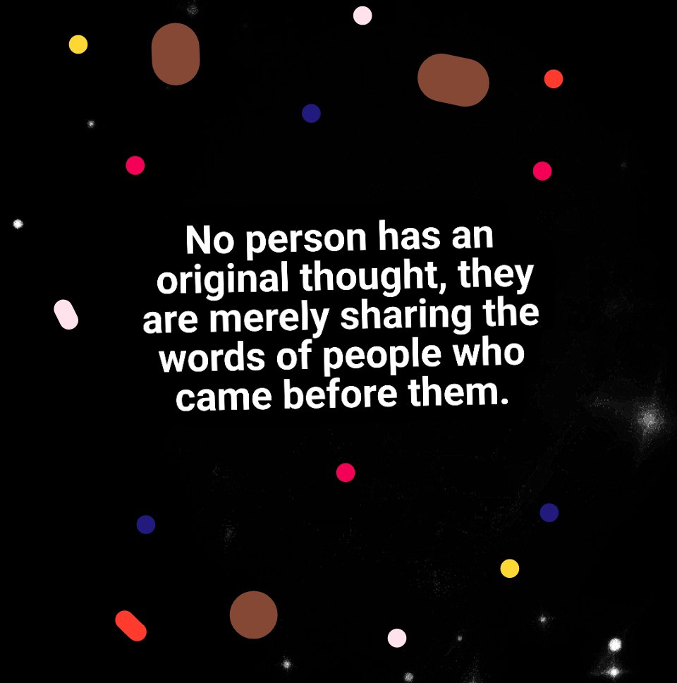 Nobody is born with knowledge. It’s something people acquire as they travel through life. It’s for that reason that there’s no such thing as original thought. That’s not to say that everyone possesses the same knowledge or thoughts for that matter because while some people soak up knowledge everywhere they go, others are inclined towards avoiding it. I’ll leave you with one final thought.